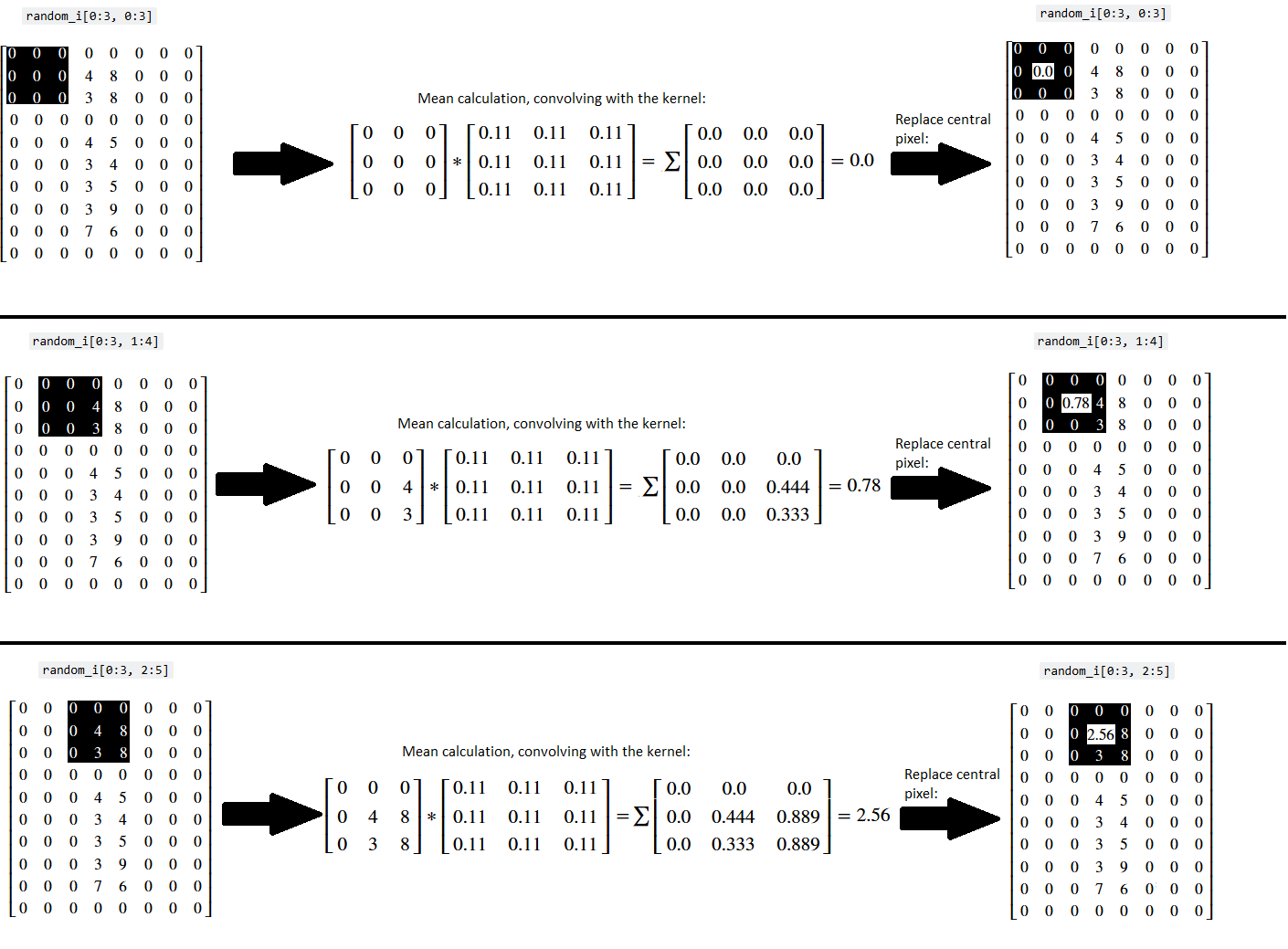 np.mean, to the selected pixel values, calculate a new value to replace the target pixel value in the output image.