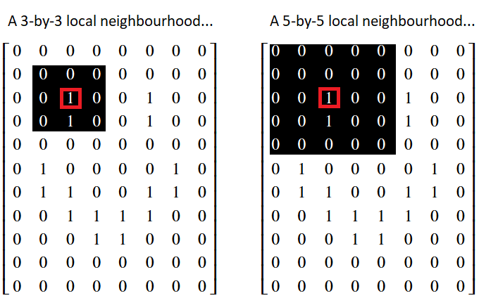 The mean filter is a local filter, because it alters a given pixel’s value based on the values of other pixels in the surrounding “local neighborhood”. The image below shows the pixel values in the smiley image array that we created on an earlier page. Two possible “local neighborhoods” are shown for a given pixel, which is highlighted in red. One neighborhood is 3-by-3, and the other is 5-by-5 — we could use either when using a local filter: