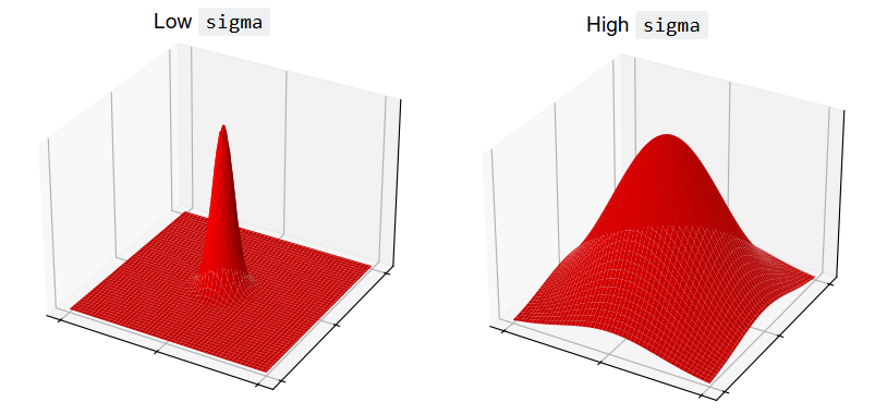So array pixels which fall under higher points of the kernel’s “red mountain” will exert more influence on the weighted average, and pixels falling under lower points will exert a weaker influence. The central pixel, laying under the crimson peak, will exert the most influence on the weighted average.