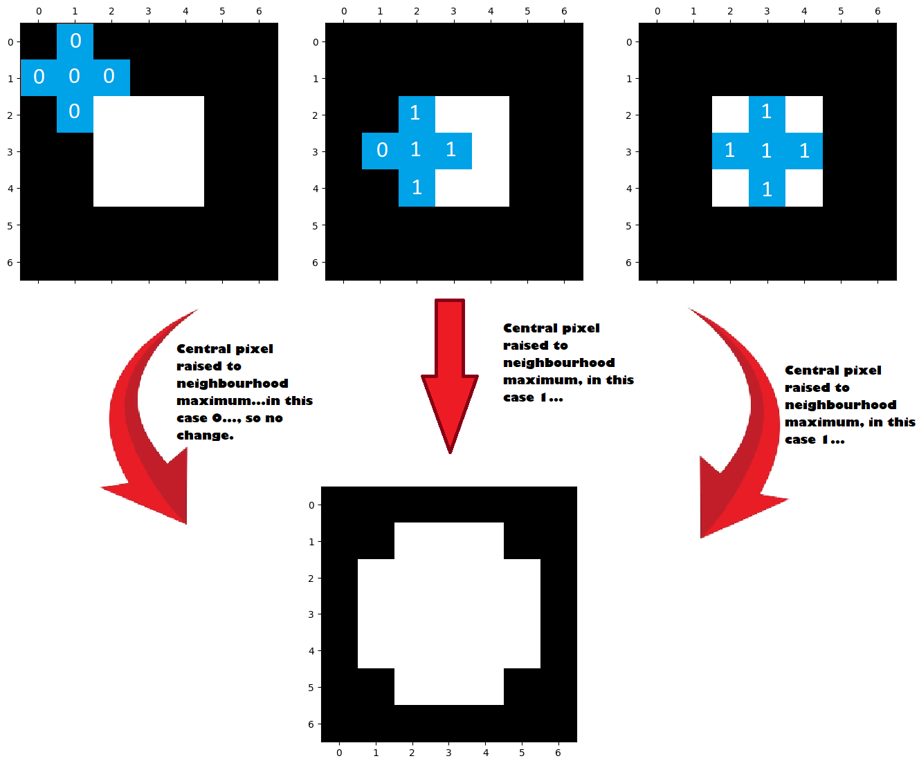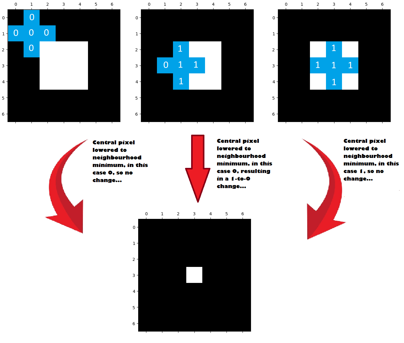 It can be easier to think of erosion (and dilation) in terms of their effects on simple binary (True / False, 1 / 0) images.