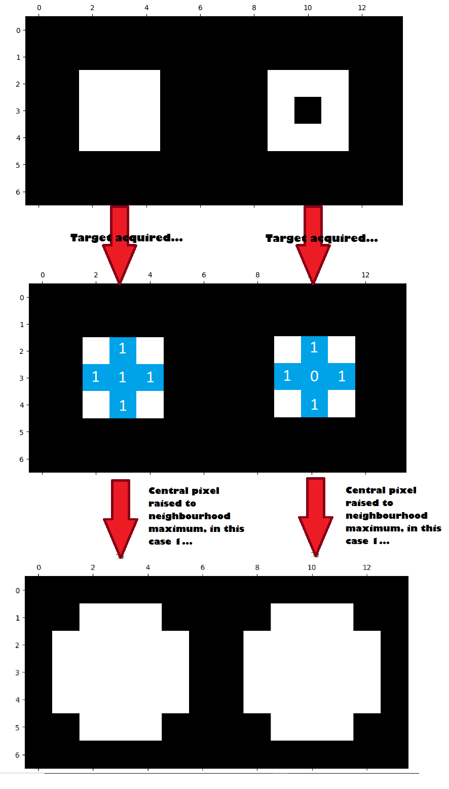 You will see other tutorials refer to footprints as structuring elements or structural elements. We stick to “footprint” here for compatibility with the Scikit-image terminology, but a footprint is identical in meaning to structuring/structural element.