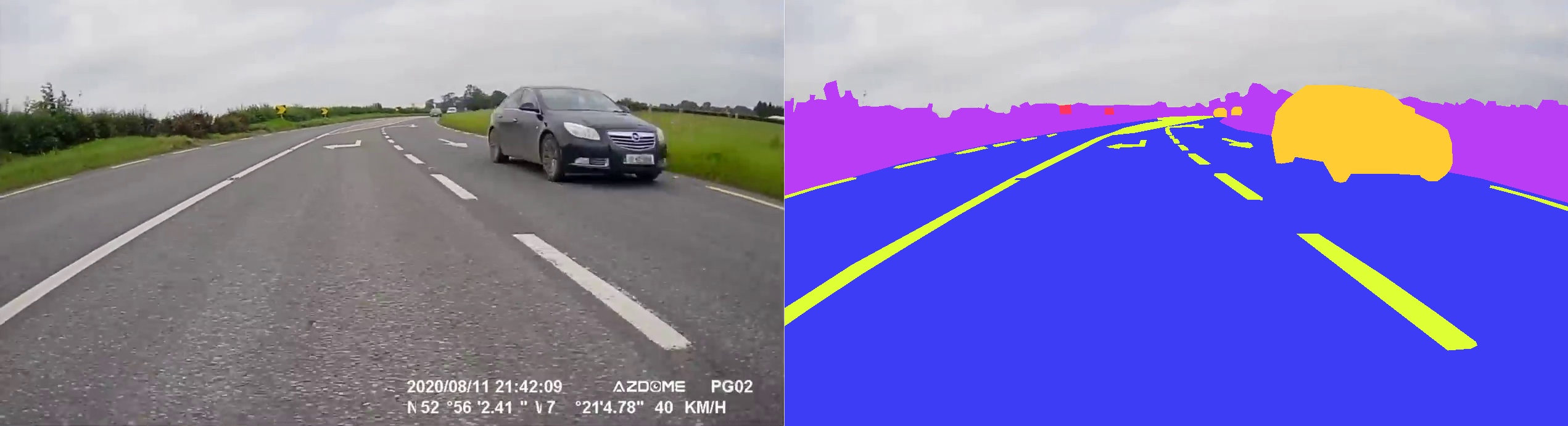 To take another example, self-driving cars use cameras, and therefore digital images, to look for (segment) important objects in their environment, such as other cars. Here’s an example where an image segmentation algorithm has split the input image (in the left panel) into segments (in the right panel), including a nearby car.